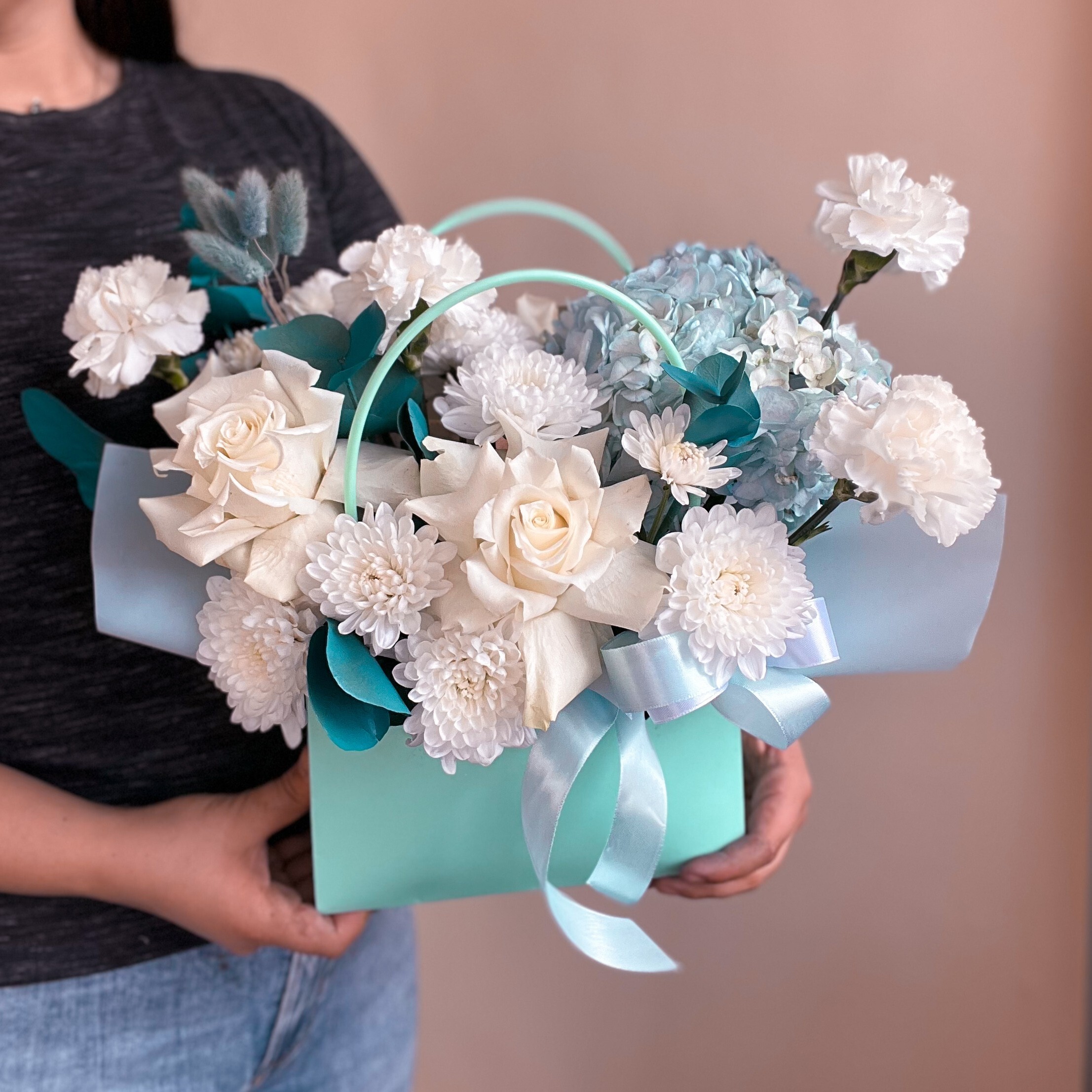 Это утонченная композиция в сумочке сочетает нежные оттенки белого и голубого. В составе французские розы, гвоздики, гортензии, кустовая хризантема и эвкалипт. Эта сборная сумочка излучает изящество и шарм, она станет прекрасным подарком для особенного случая.