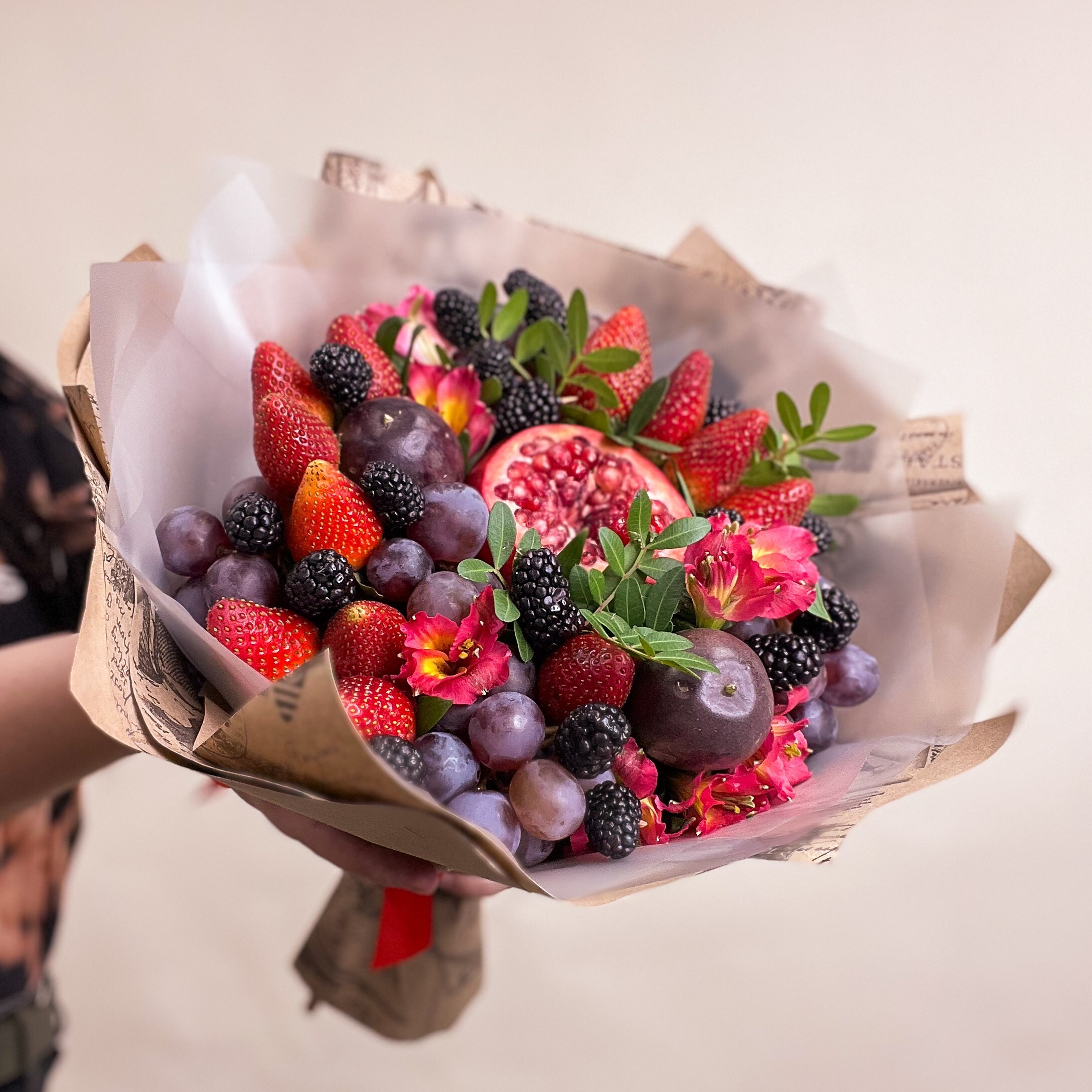 Фруктовый букет из граната, маракуйи, винограда, ежевики, клубники и альстромерии – это праздник вкуса и цвета! Яркие ягоды и экзотические фрукты создают уникальную композицию, которая притягивает взгляд и радует душу. Гранат с его сочными зернами символизирует изобилие, маракуйя удивляет тропическим ароматом, а виноград добавляет сладость.
