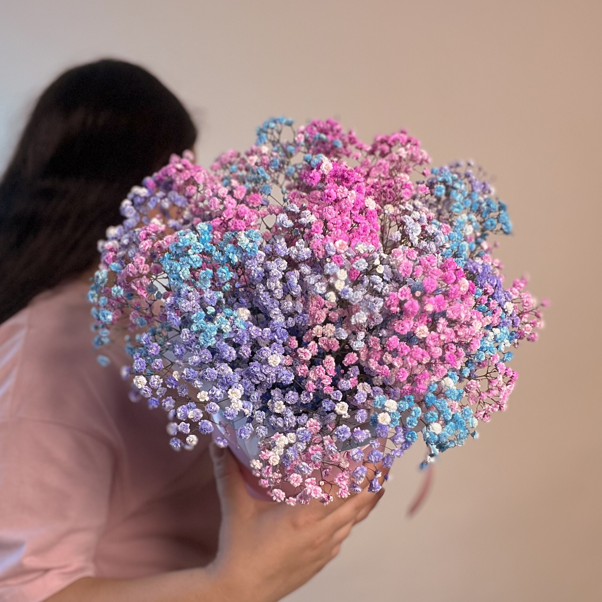 Эта изящная композиция из гипсофилы станет настоящим украшением любого пространства. Каждая веточка гипсофилы, умело окрашенная в разнообразные нежные и яркие оттенки, гармонично собрана в стильную коробку. Такое цветочное решение подходит как для создания праздничной атмосферы, так и для повседневных моментов радости. Прекрасный подарок для близких и декор для вашего интерьера, придающий ему свежесть и утонченность.