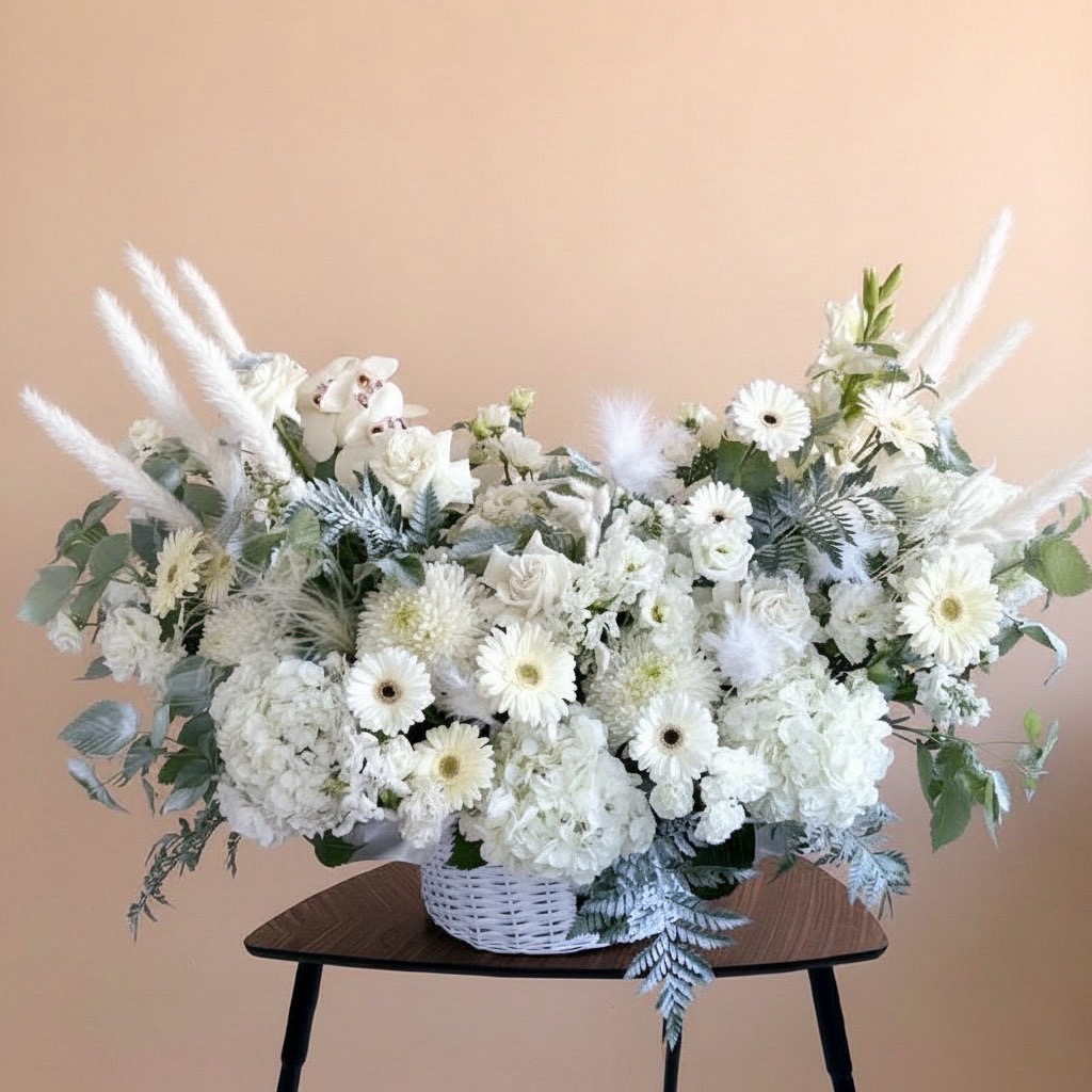 Белоснежная корзина цветов — идеальный подарок для самых разных событий. В основе композиции — нежные гортензии, воздушная эустома и классические французские розы, которые создают объем и текстуру. Белые герберы придают свежесть и радость, гвоздики добавляют стойкости букета, а орхидея Цимбидиум становится центральным акцентом, привлекая взгляд своей элегантностью. Сухоцветы аккуратно вплетены в композицию для тонкого винтажного акцента, а зелень подчеркивает чистоту оттенков и делает корзину живой и натуральной.
