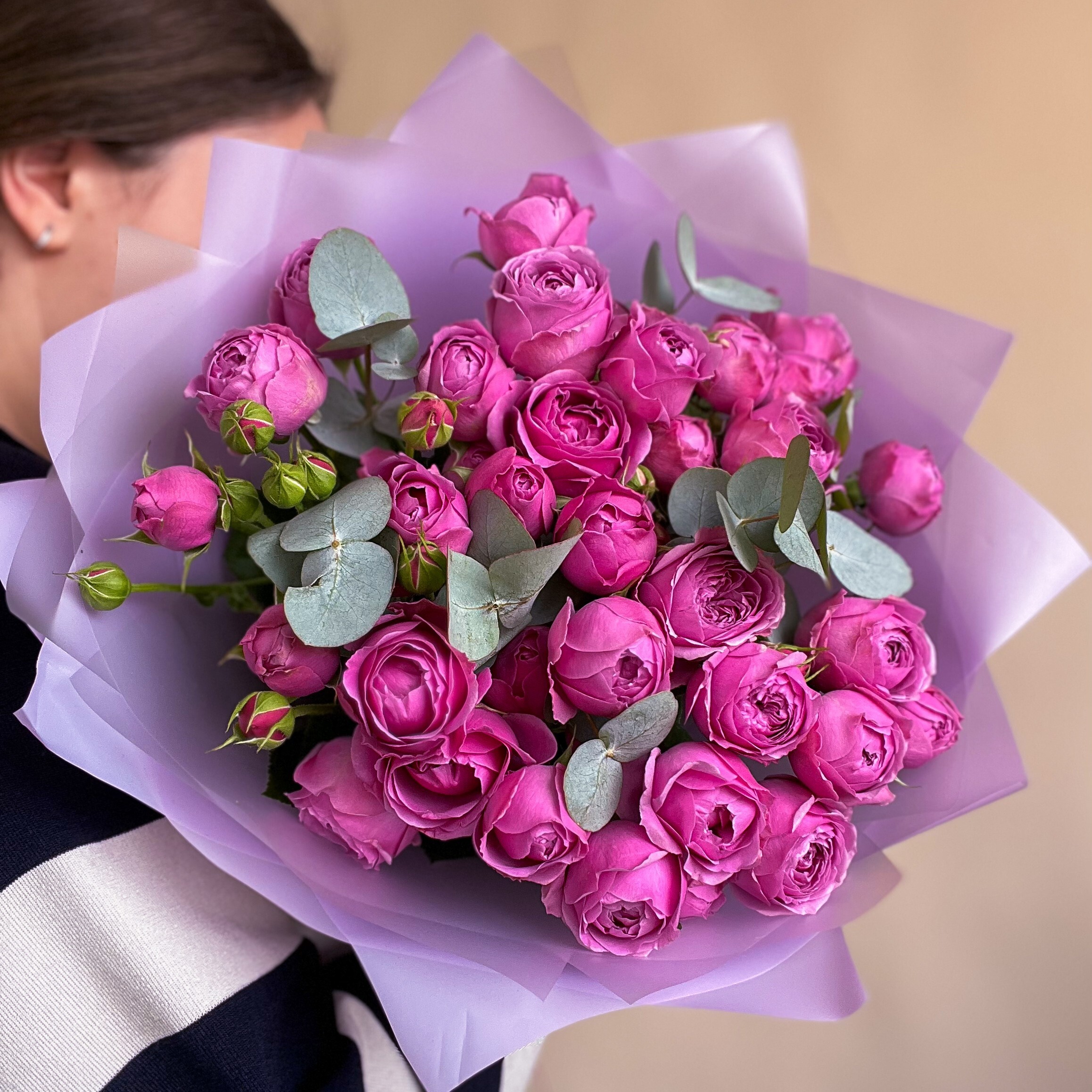 Этот букет из кустовых пионовидных роз в яркой малиновой гамме создает впечатление пышной и элегантной композиции. Распускающиеся бутоны Мисти баблс добавляют легкости и изящества. Веточки эвкалипта придают букету свежесть и аромат. Этот букет - идеальный подарок, который поразит своей красотой и изысканностью.