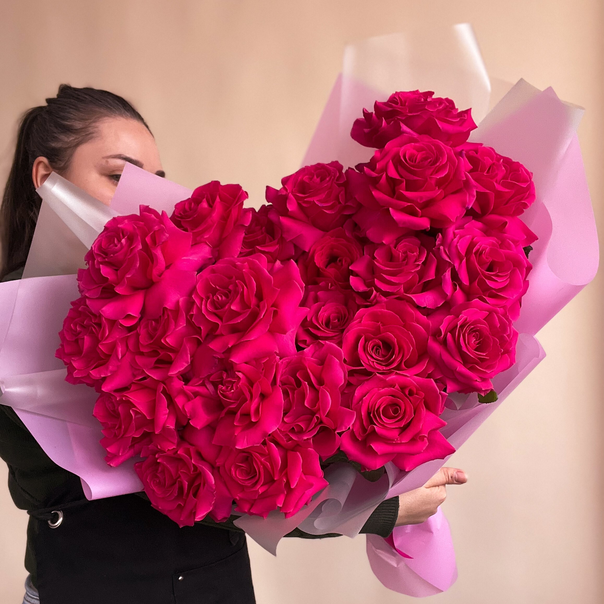 Яркий и объемный букет из 25 штук французских роз в ярком малиновом оттенке. Эти изысканные цветы наполнят пространство ароматом и красотой, придавая особый шарм любому интерьеру. Идеальный подарок для выражения глубоких чувств и желаний показать внимание и заботу. Каждый цветок как произведение искусства, созданный для радости и восхищения.
