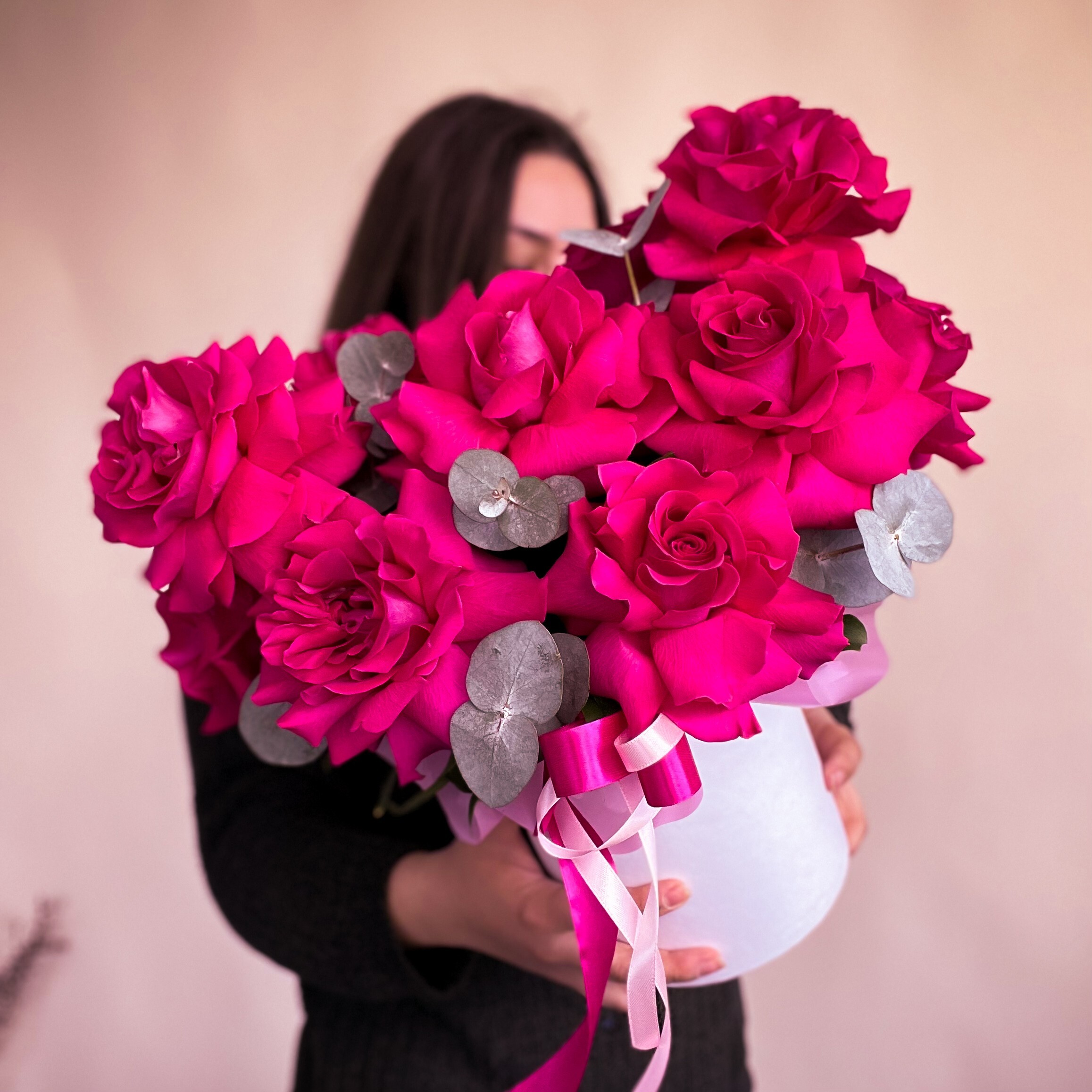 Яркая малиновая французская роза великолепно дополняется зеленью эвкалипта в элегантной коробке. Эта композиция излучает неповторимый шарм и изысканность, в нем соединились красота и изящество. Великолепный подарок, который порадует глаз своим утонченным обликом.