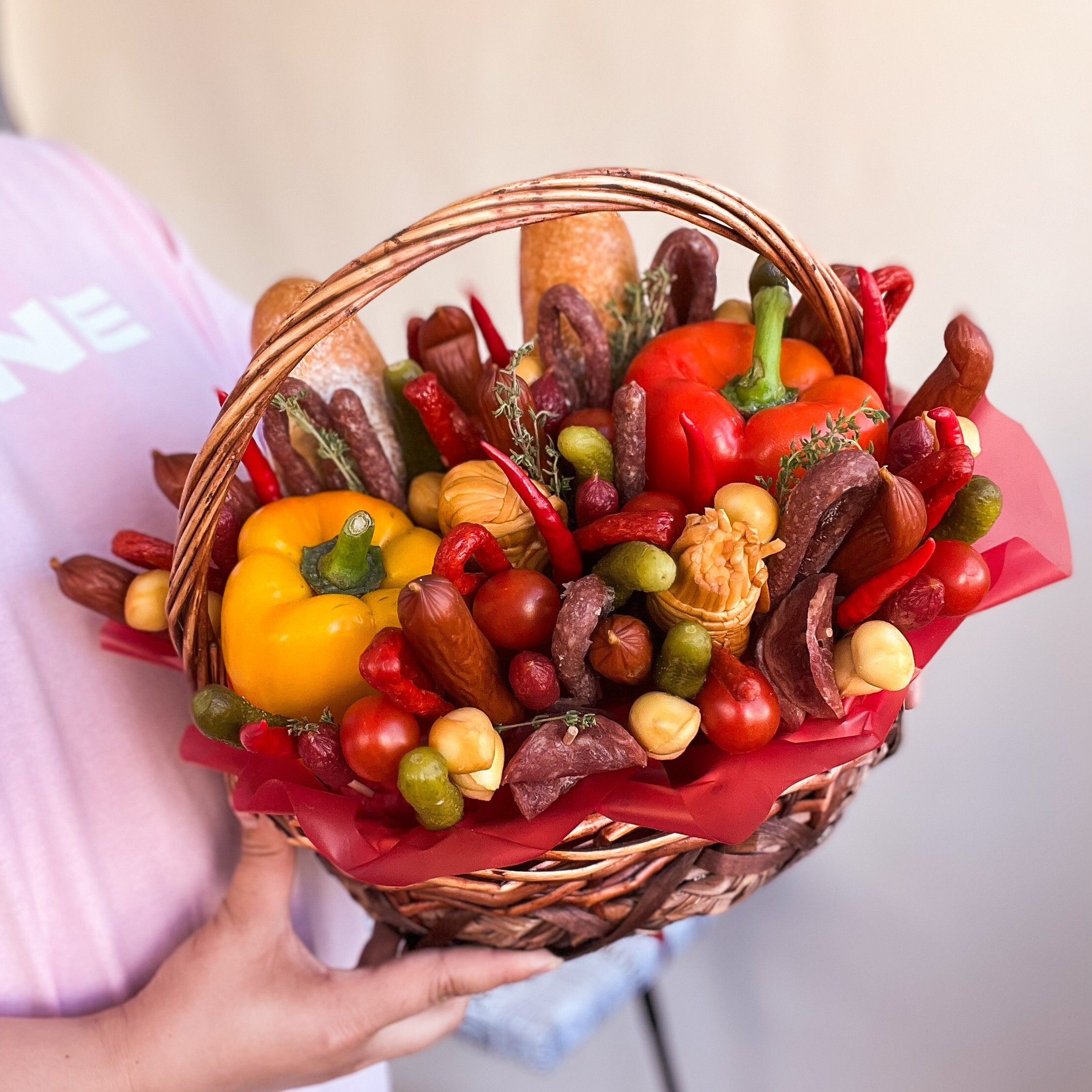 Эта изысканная мужская корзинка — настоящая находка для ценителей вкусной еды и оригинальных закусок. В центре композиции расположились аппетитные копченые колбаски, готовые порадовать своим насыщенным вкусом. Яркие болгарские перцы и острые перцы чили добавляют яркие нотки, придавая корзинке визуальную привлекательность.