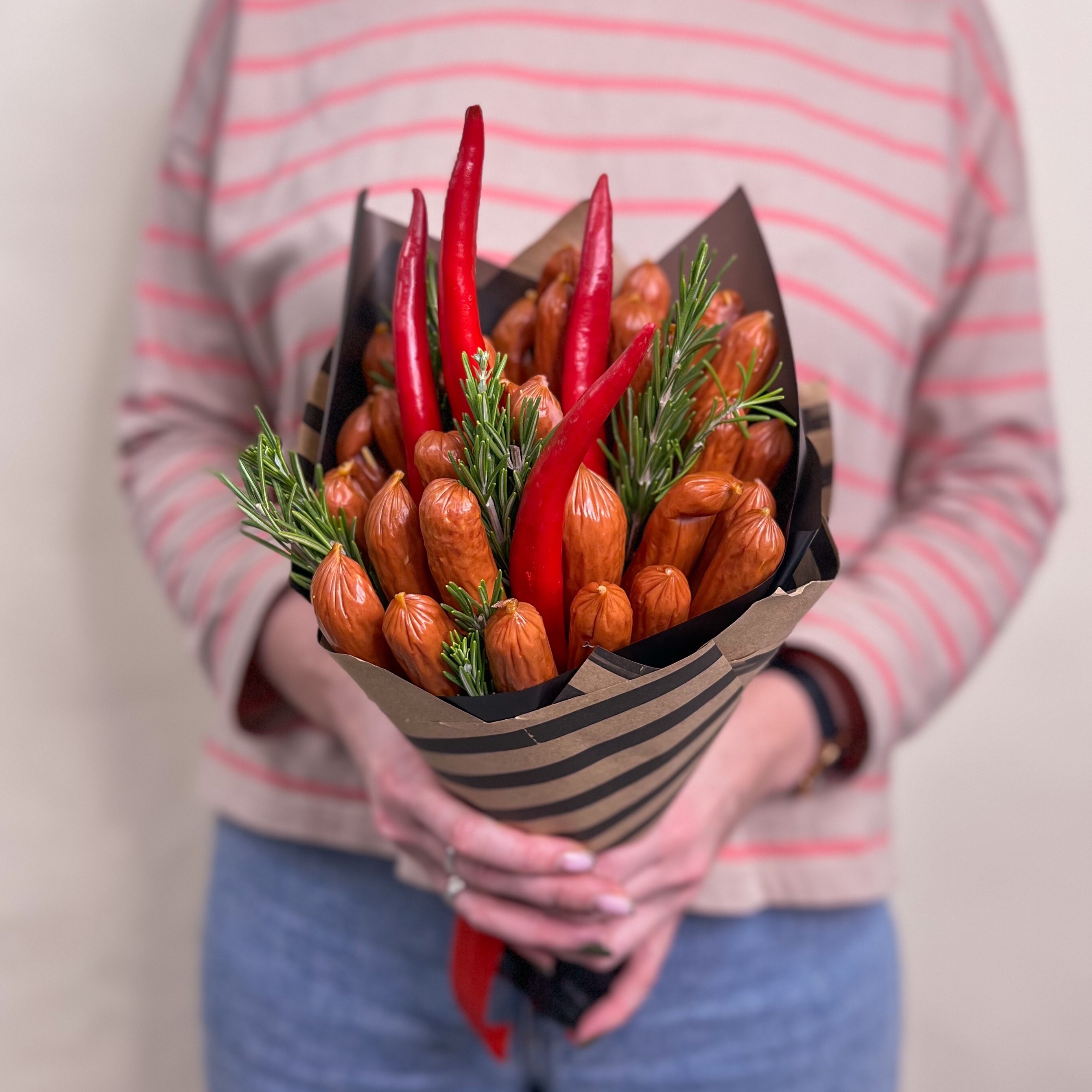 Этот стильный мужской букет – воплощение силы и изысканности. В его центре расположены аппетитные копченые колбаски, обладающие насыщенным ароматом и богатым вкусом, которые мгновенно привлекают внимание.