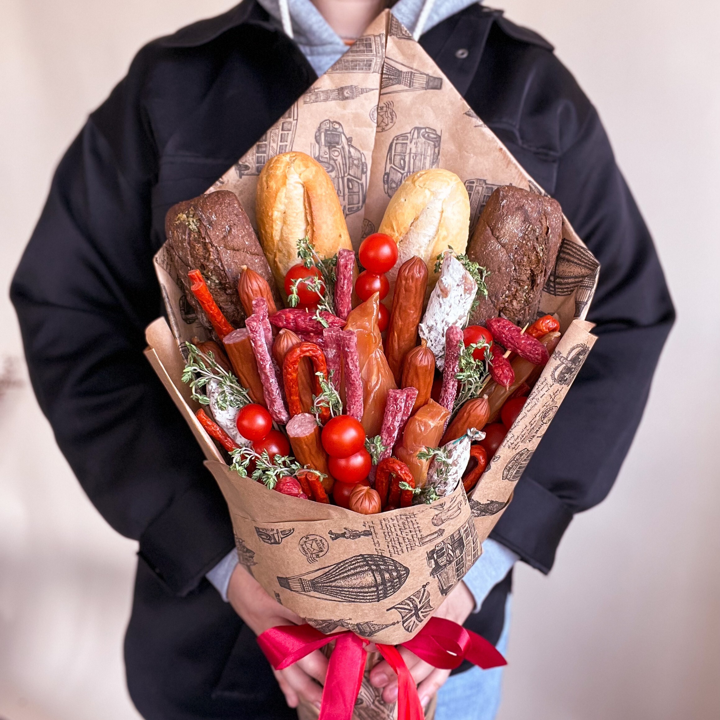 Оригинальный мужской букет – это идеальное сочетание копченых колбасок, пивчиков, пиколини, карпаччо из курицы, помидоров, колбасы фуэт и ароматной зелени в крафтовой упаковке. Вкусный, ароматный подарок, который порадует истинного гурмана!
