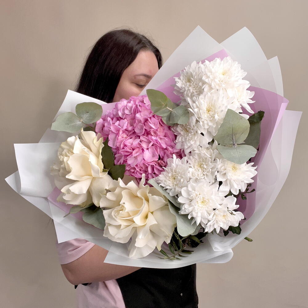 Букет из белых французских роз, розовой гортензии, белых кустовых хризантем и эвкалипта — гармоничное сочетание нежности и свежести. Белые розы дарят чистоту и элегантность, розовая гортензия добавляет объем и мягкость, а белые кустовые хризантемы придают изысканность и воздушность. Эвкалипт наполняет композицию свежим ароматом и живым зелёным оттенком. Такой букет идеально подойдет для романтических и торжественных событий, выражая утонченность и естественную красоту.