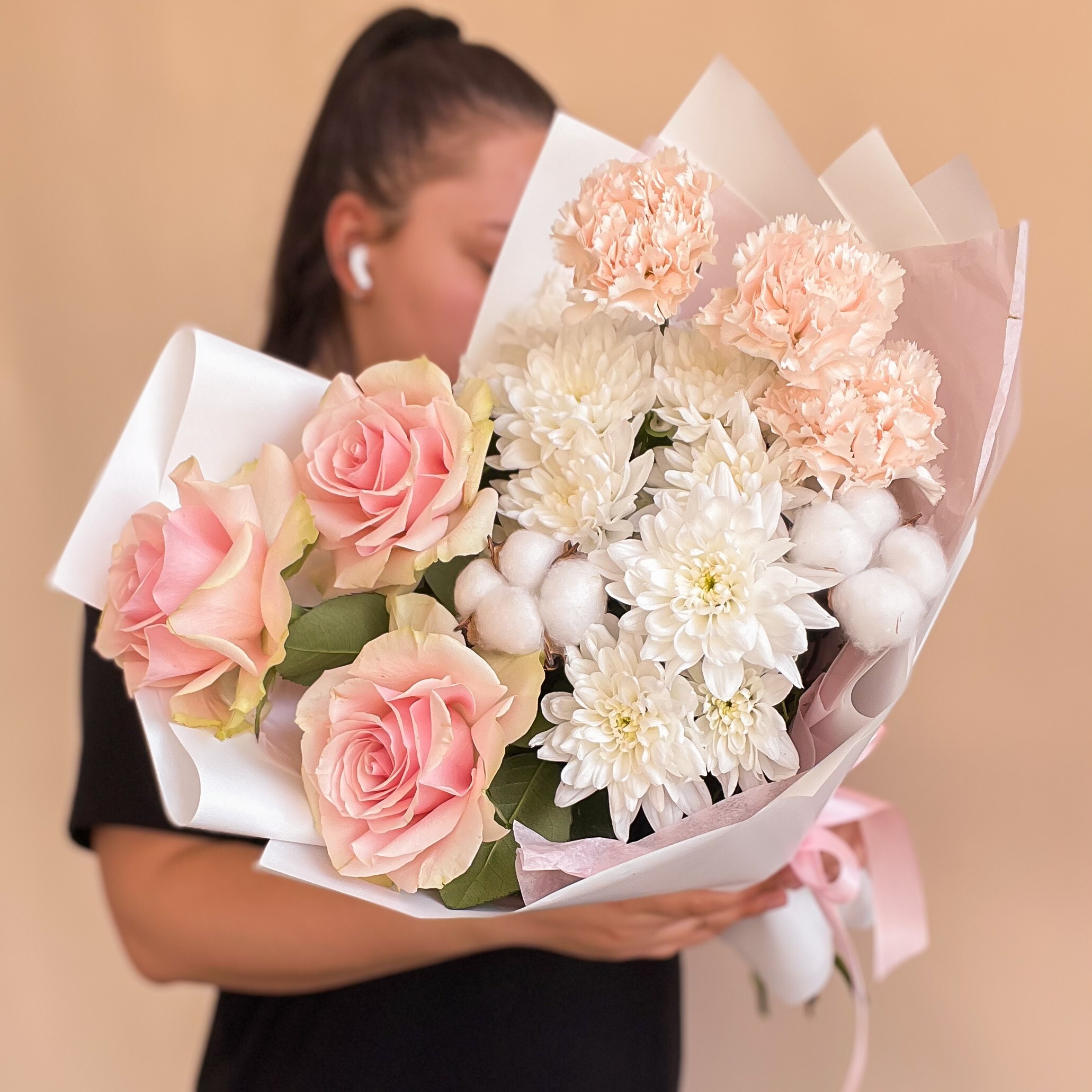 Авторский букет олицетворяет нежность и элегантность. Он создан из розовых и белых цветов: кустовой хризантемы, ароматной французской розы и нежной гвоздики. Сборный и пышный, он украшен белым хлопком, добавляющим текстуры и легкости композиции. Букет - это идеальный подарок, который воплощает в себе красоту и изысканность, отражая теплые чувства и нежные эмоции.