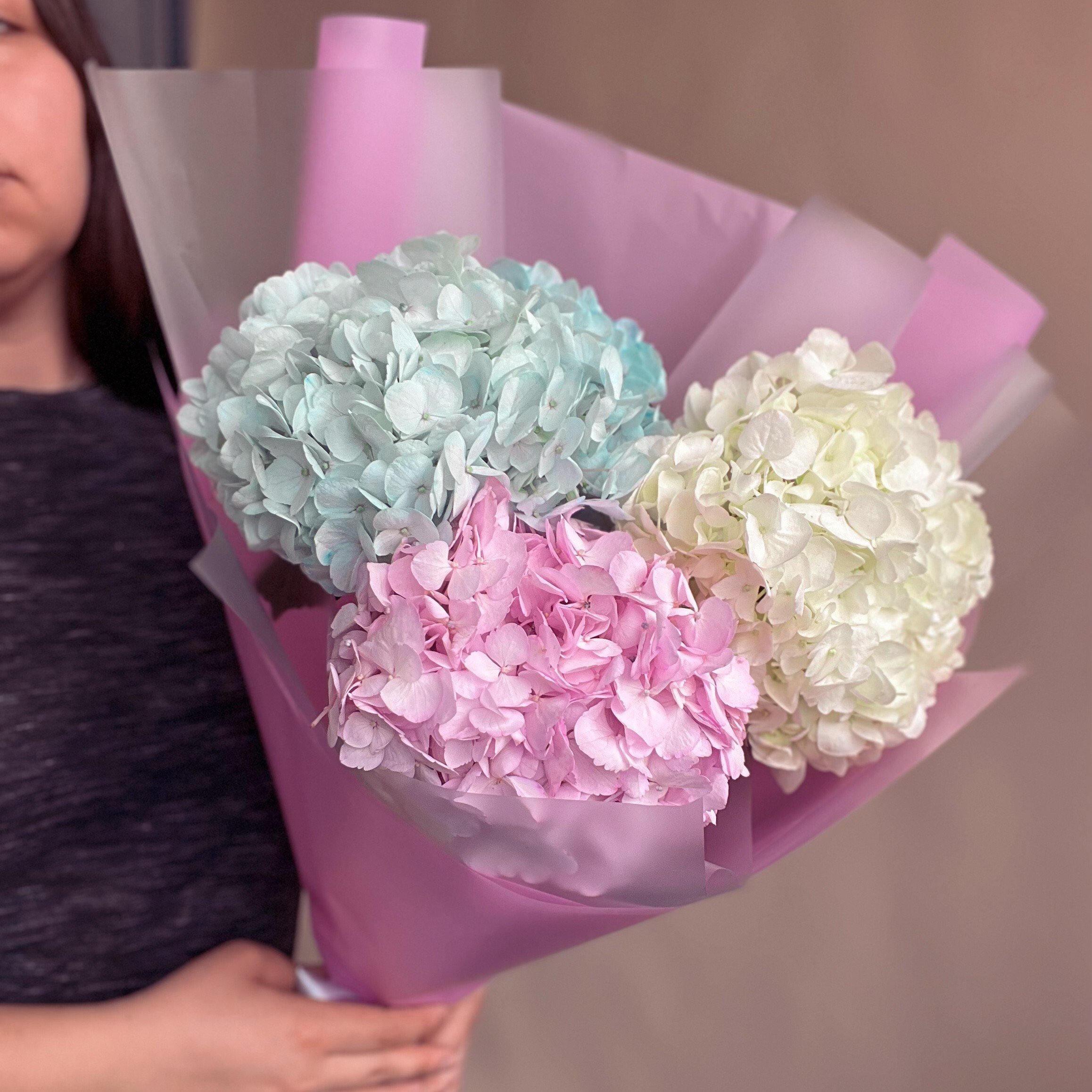 Пышный и нежный разноцветный букет из трех гортензий: голубой, розовой и белой. Такое сочетание цветов придает букету особую нежность и неповторимое очарование. Гортензии символизируют благополучие и изобилие, а их объемные соцветия наполнят пространство уютом и красотой. Этот букет станет прекрасным подарком для тех, кто ценит красоту и изысканность.
