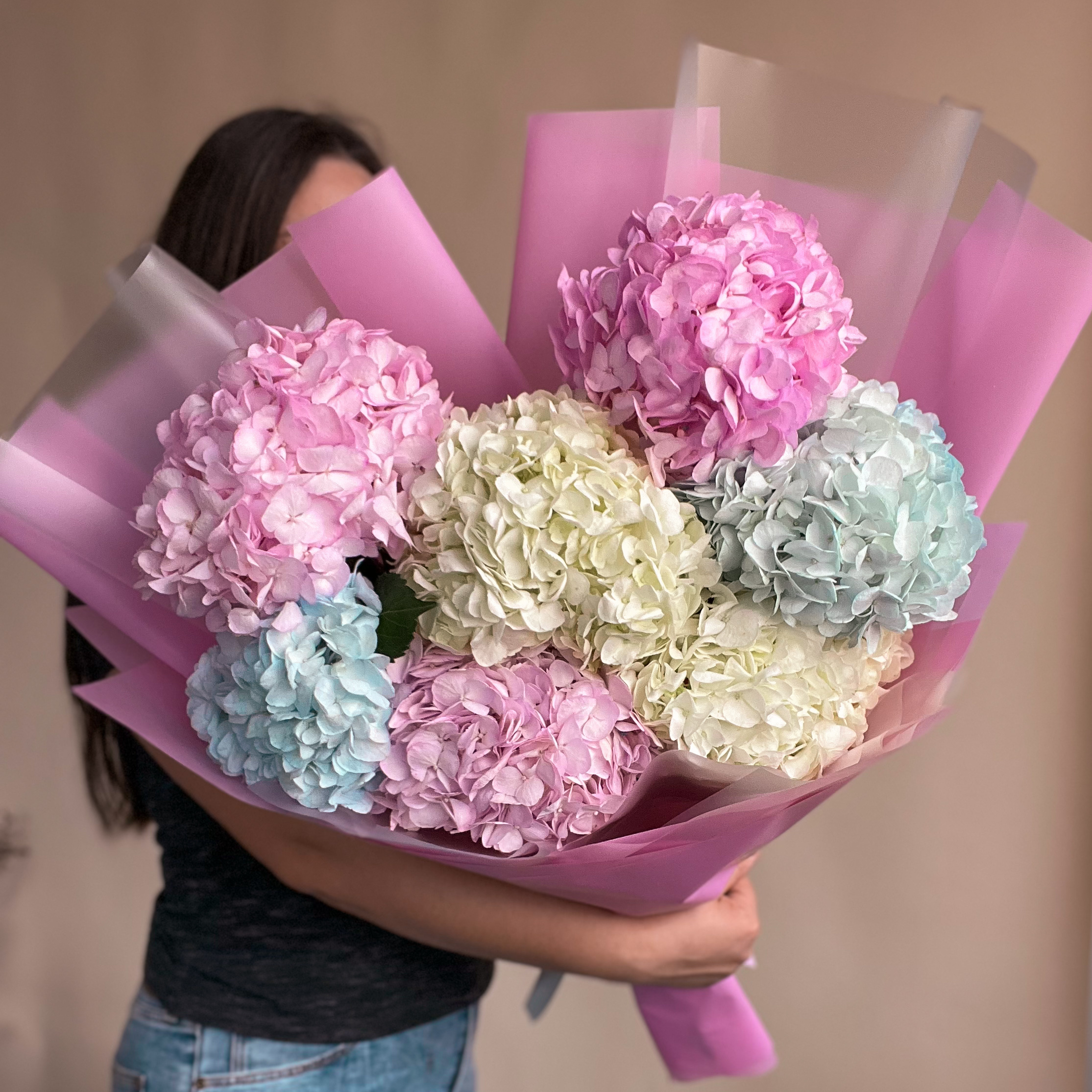 Пышный разноцветный букет из семи гортензий в нежных оттенках: голубой, розовый и белый. Этот изысканный состав цветов создает удивительно нежную и романтическую атмосферу. Гортензии являются символами благополучия и изобилия, а их объемные соцветия наполняют пространство уютом и теплотой. Букет станет прекрасным подарком для проявления чувств и моментов нежности важным для вас людям.