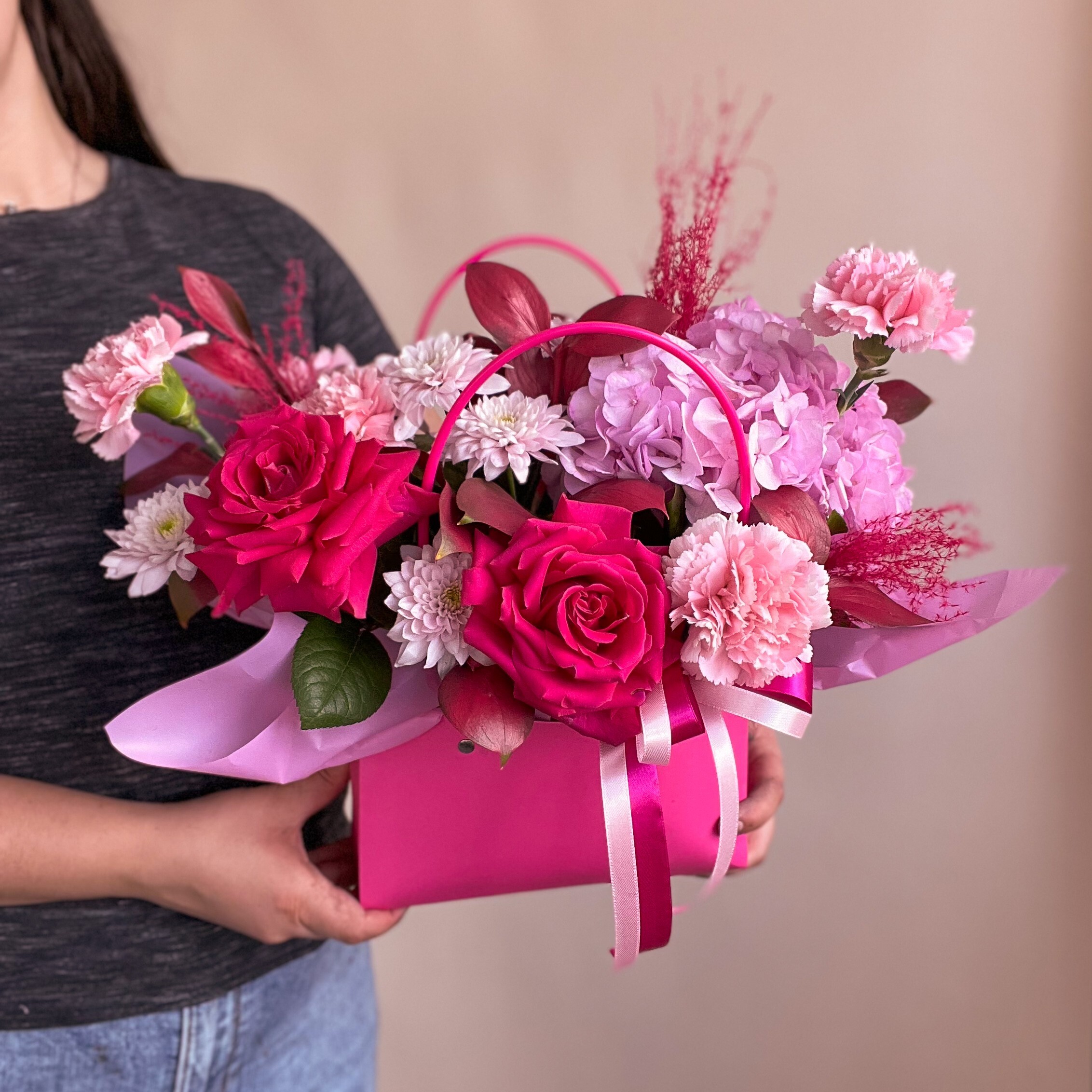 Эта яркая и утонченная композиция в сумочке собрала в себе роскошные розовые и малиновые оттенки. В составе французские розы, гвоздики, гортензии, кустовая хризантема и крашеная зелень. Создавая волнующий образ, пышная и объемная композиция станет незабываемым подарком для особых моментов в жизни.