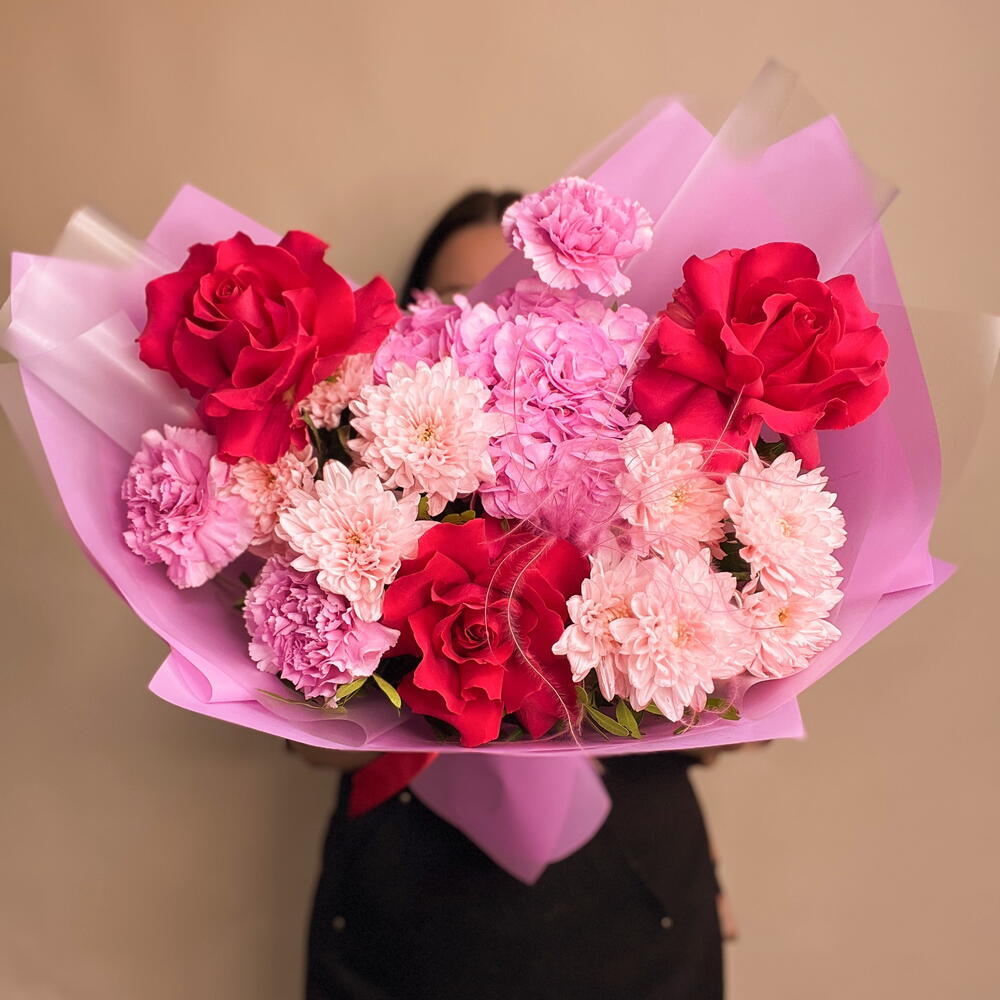 Этот элегантный букет сочетает насыщенные малиновые французские розы с нежной розовой гортензией, создавая мягкий и романтичный образ. Кустовая хризантема придаёт объём и живость, добавляя текстурную глубину. Розовые гвоздики вносят изящество и утончённость, а малиновая стифа завершает композицию яркими, насыщенными акцентами. Такой букет идеально подходит для выразительного и стильного подарка.