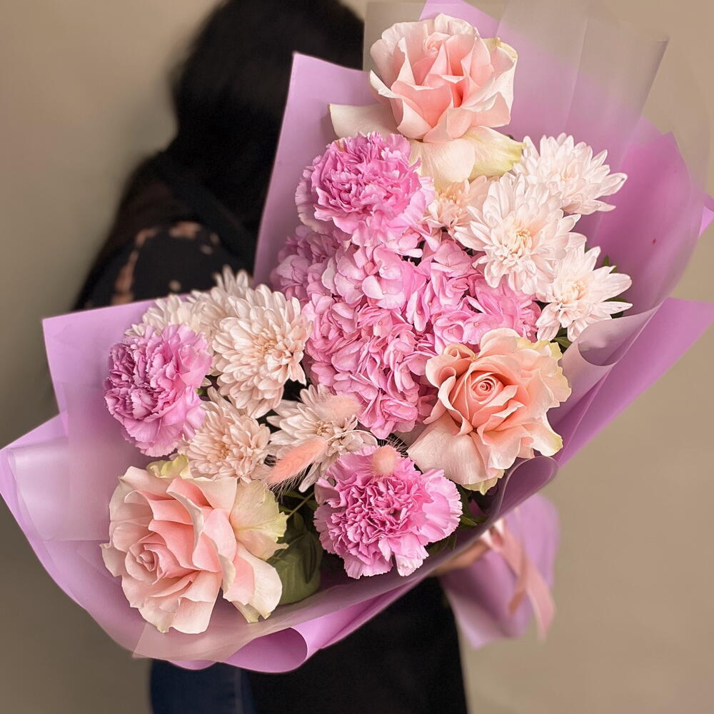 Этот изысканный букет объединяет нежность и элегантность розовых французских роз с пышностью и текстурой розовой гортензии. Кустовые розовые хризантемы добавляют объёма и разнообразия форм, внося лёгкую игривость. Розовые гвоздики завершают композицию деликатными нотками свежести и грации. Такой букет идеально подходит для выражения романтических и тёплых чувств, сочетая утонченность и гармонию оттенков в пастельной палитре.