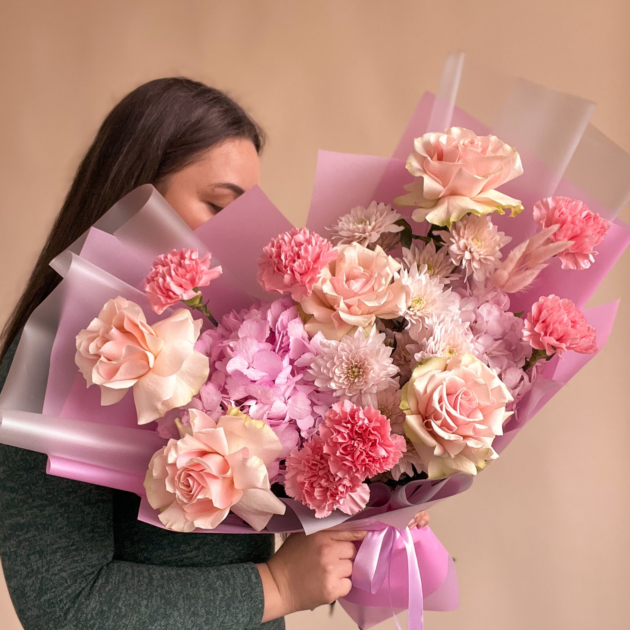 Нежный и романтичный сборный букет в оттенках розового цвета. В его состав входят изысканные французские розы, пушистые гвоздики, нежные гортензии и кустовые хризантемы. Благодаря сочетанию этих цветов букет выглядит пышным и объемным, придавая особый шарм и изысканность вашему празднику.