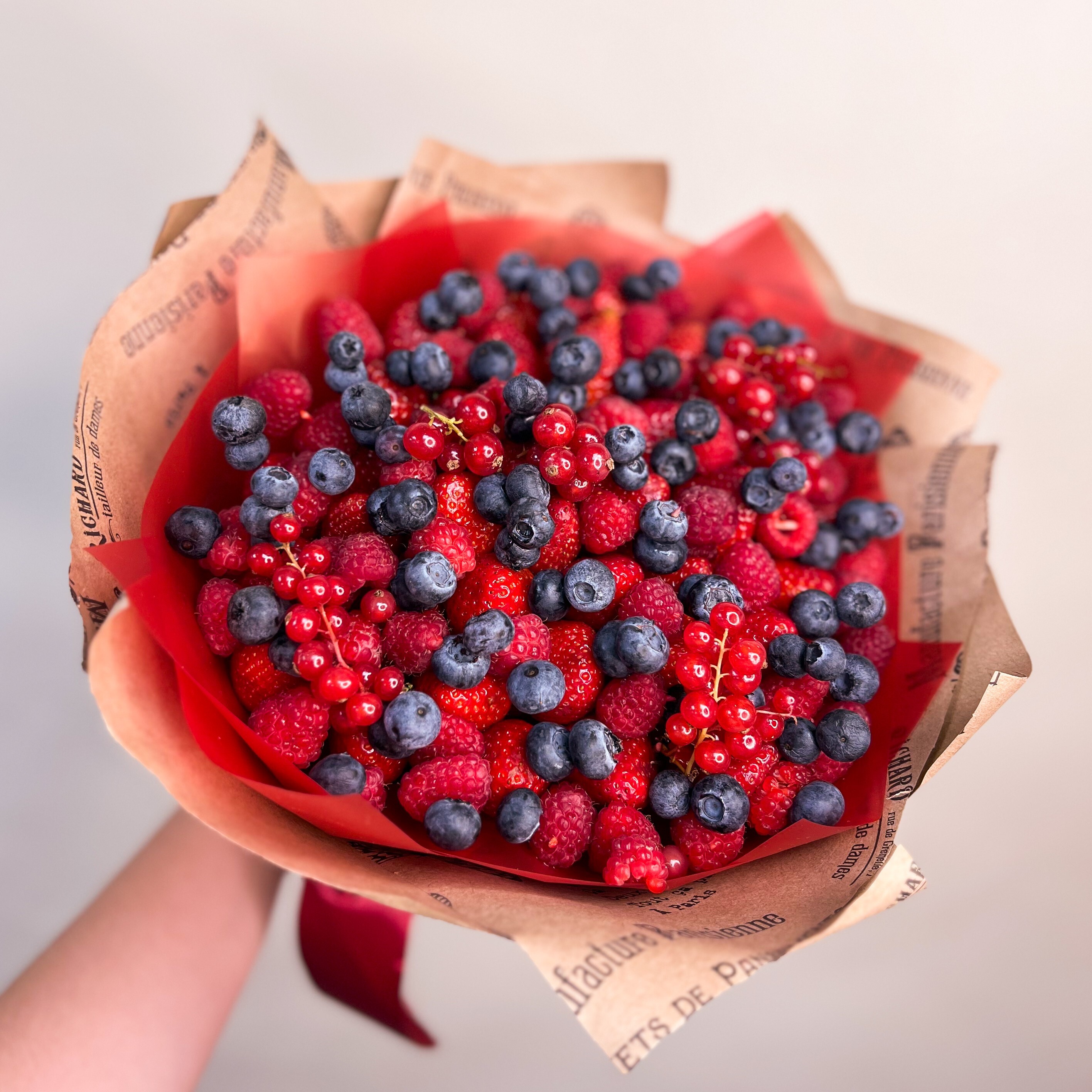 Красная смородина придаёт композиции яркость и контраст, делая её поистине уникальной. Этот букет станет отличным подарком для ценителей ягод, напоминая о летнем солнце и свежести природы, идеально подходя для любого праздника или торжества.