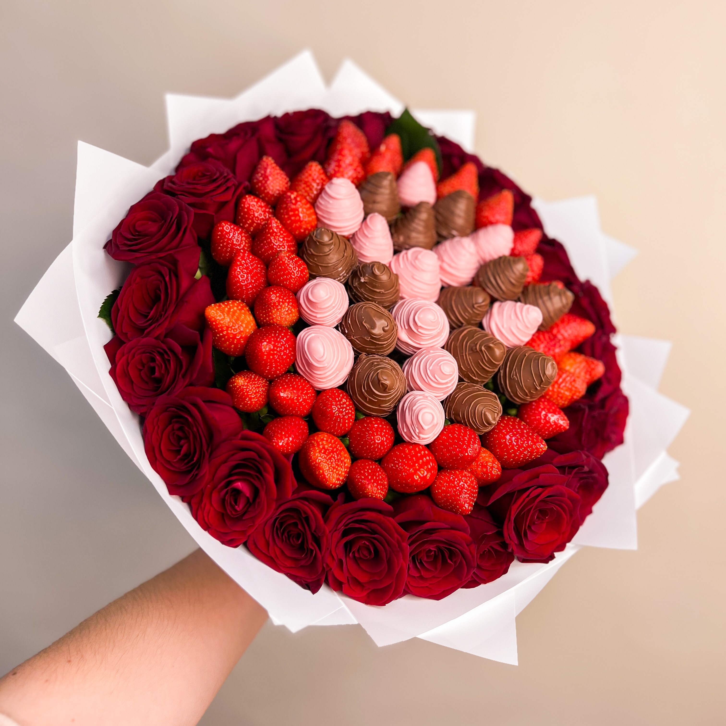 Ягодный букет с красными розами, клубникой и клубникой в шоколаде – это идеальное сочетание романтики и изысканности. Красные розы символизируют страсть и нежность, а свежая клубника добавляет сладости и ярких красок. Каждая ягода вручную отбирается, чтобы гарантировать качество и вкус.