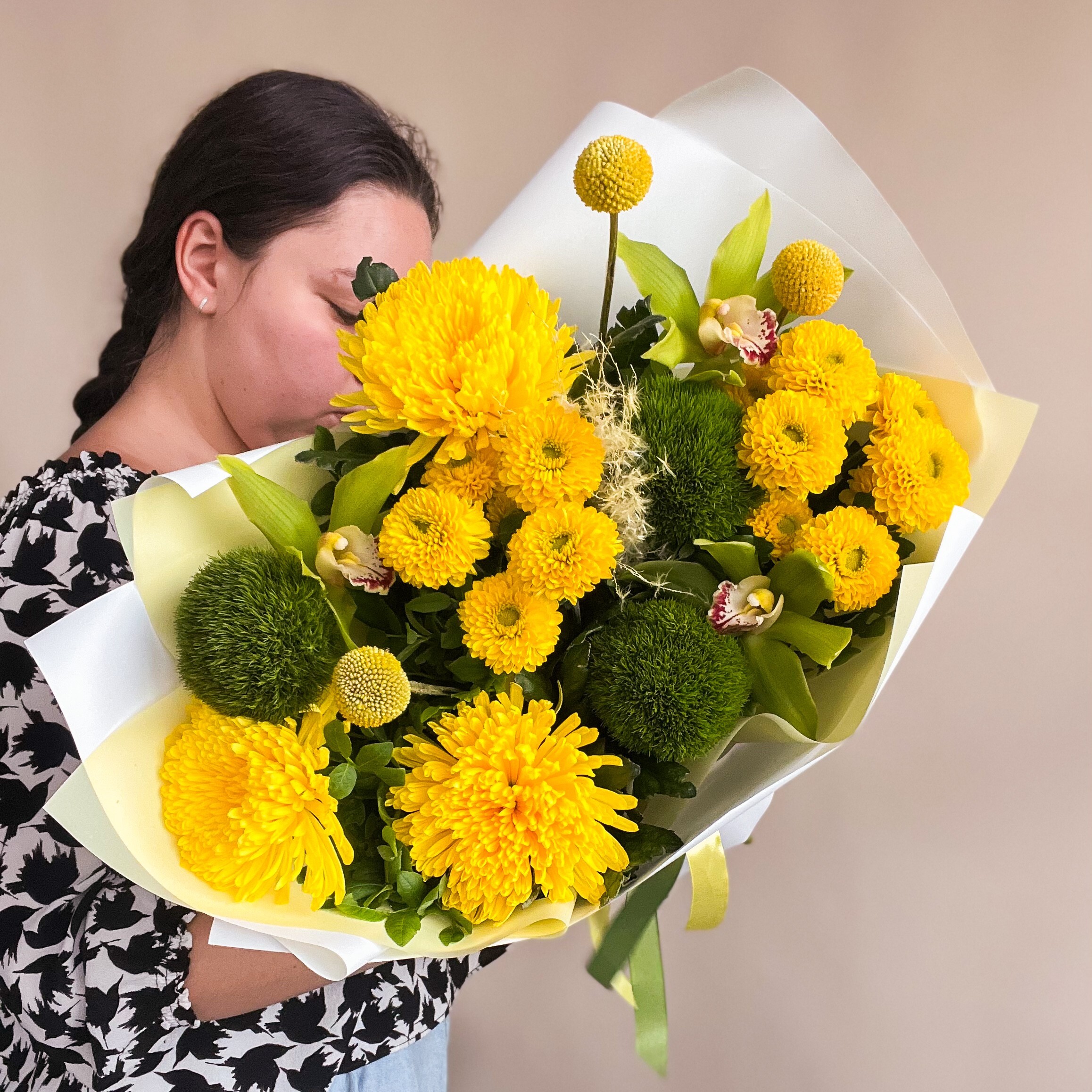 Яркий и свежий букет собран из разнообразных цветов: желтых хризантем, зеленой гвоздики и орхидей Цимбидиум. Зеленые и желтые оттенки создают удивительный контраст, наполняя композицию яркими красками. Пышный и объемный букет идеально подойдет для особого случая. Этот сборный букет прекрасно дополнит образ и станет настоящим украшением в любом интерьере.